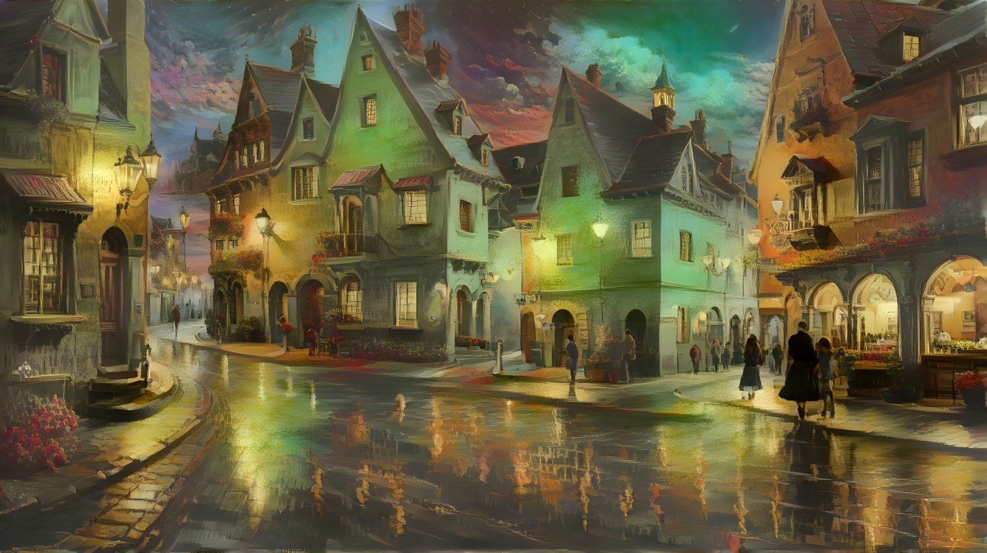 A charming, colorful street scene at night, featuring quaint houses with lit windows and glowing street lamps. The wet pavement reflects vibrant hues, creating a magical, atmospheric ambiance.
