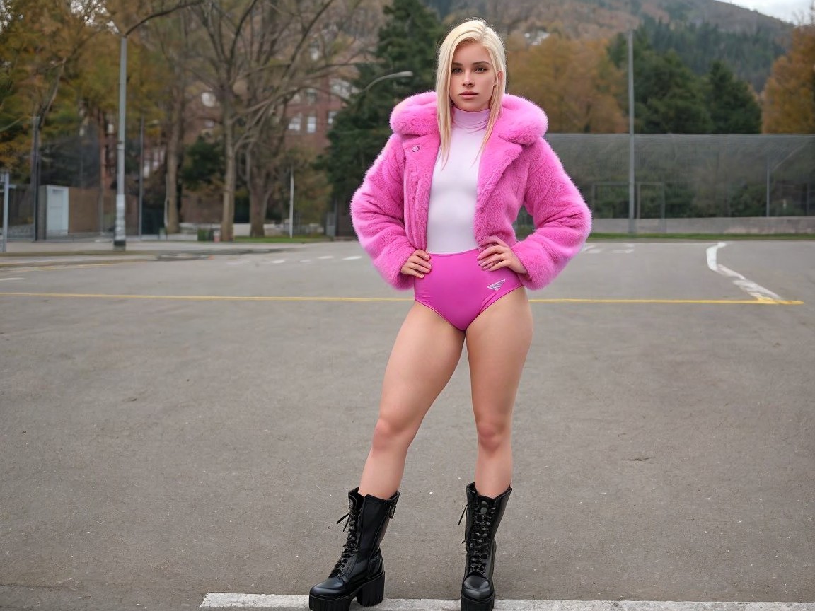 A model stands confidently in an urban setting, wearing a stylish pink faux fur jacket, a white bodysuit, and bold black platform boots, surrounded by trees and modern architecture.
