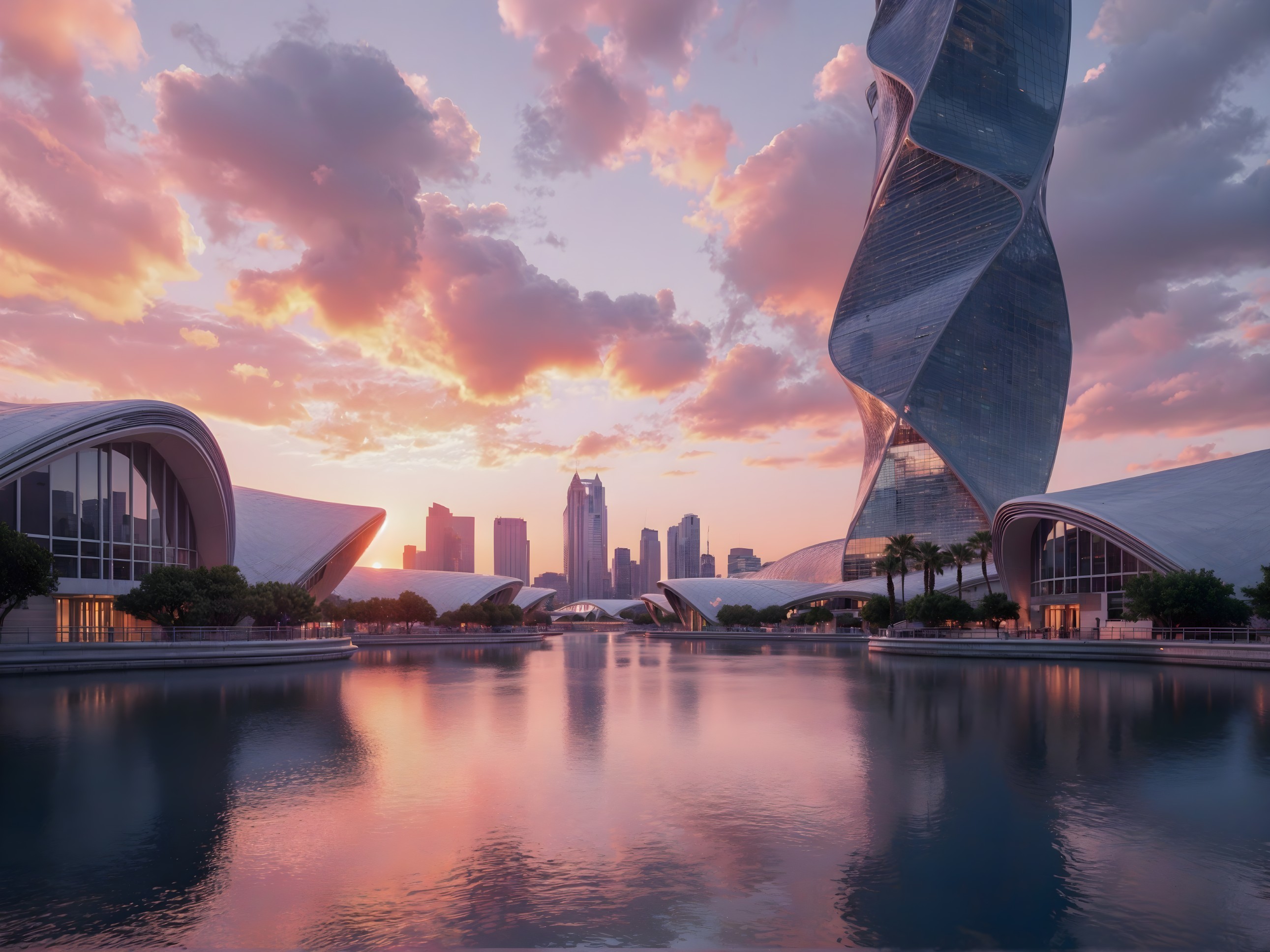A vibrant sunset illuminates a cityscape with modern skyscrapers reflected in tranquil waters. Arched white structures frame the scene, creating a striking contrast with colorful clouds.