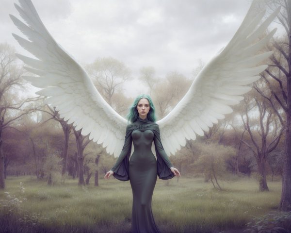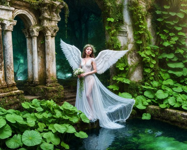 A serene scene of a mystical figure with large white wings, standing gracefully in a lush, overgrown garden. She wears a flowing, sheer gown and holds a small bouquet, surrounded by ancient ruins.