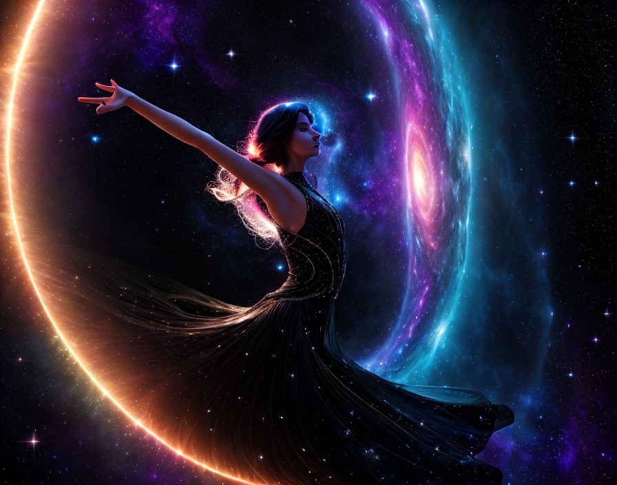 A woman in a flowing dress reaches toward a vibrant cosmic nebula, stars speckling the ethereal space around her.