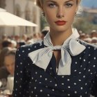 A stylish young woman with wavy blonde hair poses confidently outdoors. She wears a polka-dot blouse, radiating elegance against a backdrop of bustling streets and classic architecture.