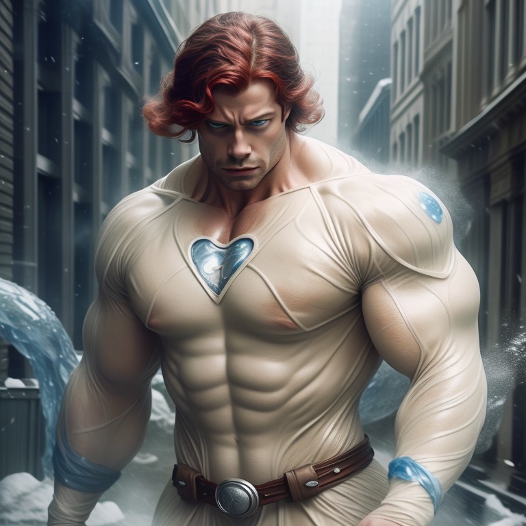 A fantastical character with vibrant blue skin and pink hair, a crystal heart, and muscle-like petals stands before a cityscape with swirling clouds.