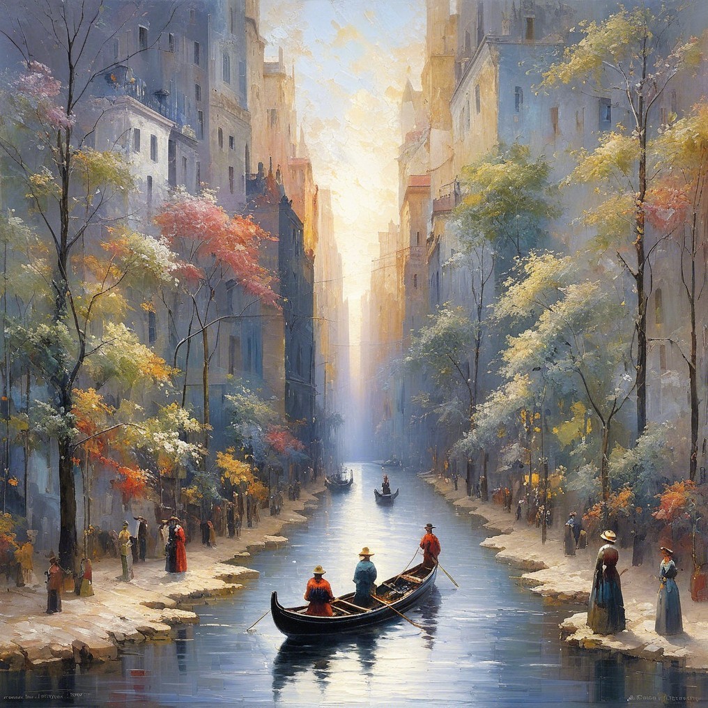 The image depicts a picturesque canal scene with elegant buildings on either side. Gondolas glide through the water as people stroll along the banks, bathed in warm, golden light.