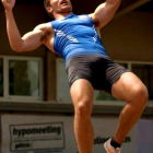 A muscular man in a blue tank top and black shorts performs pull-ups on a tree branch in a lush, green outdoor setting, showcasing his strength and athletic physique.