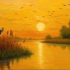 A serene sunset paints the sky in warm hues as a solitary heron wades in calm waters. Silhouetted birds soar above, while reeds frame the tranquil scene, evoking peace and natural beauty.
