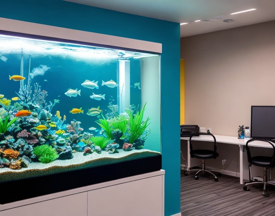 Colorful Fish and Coral Aquarium in Modern Room with Beige Walls