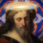 The image portrays a serene figure with long hair and an illuminated aura, framed by intricate geometric designs and vibrant colors, evoking themes of divinity and spirituality.