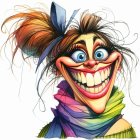 A whimsical, creepy clown with a wide grin showcases vibrant makeup and wild hair, topped with a pumpkin and witch's hat. Its colorful scarf adds a playful touch to the eerie vibe.