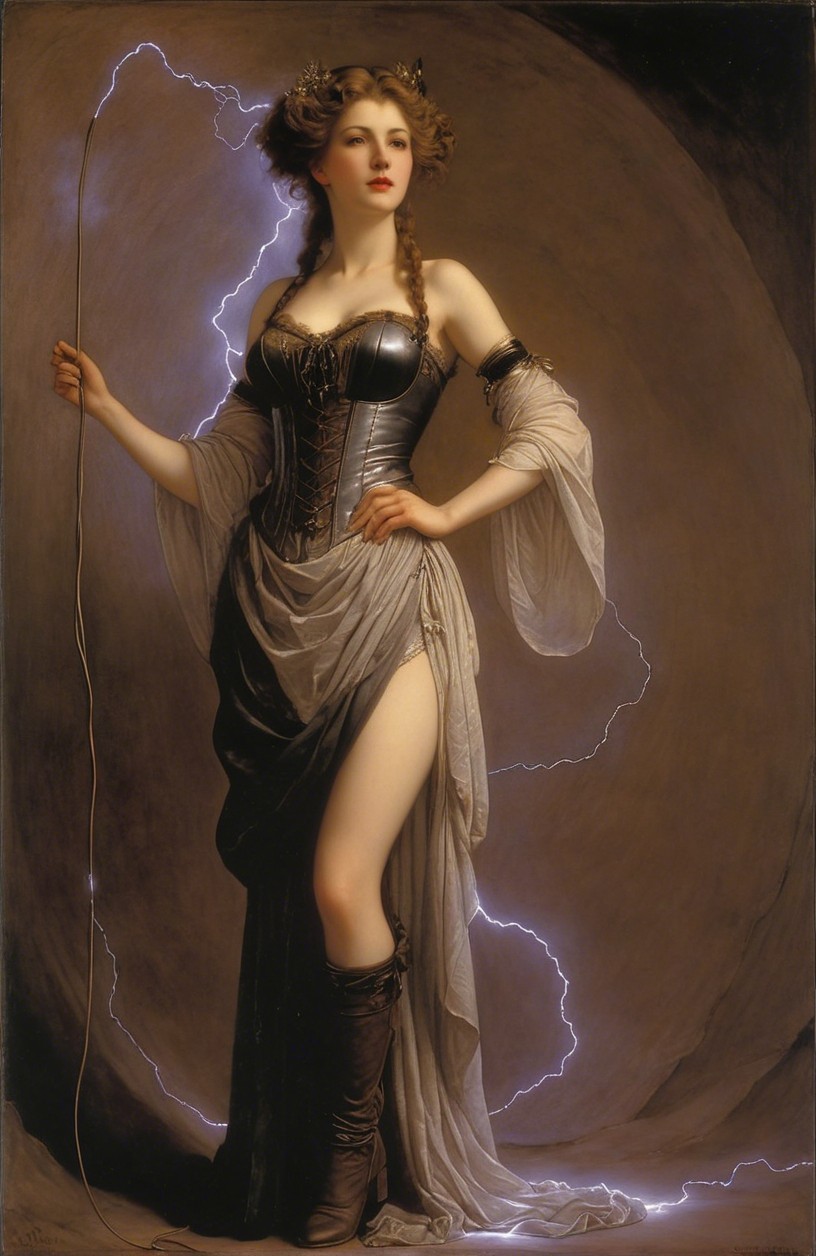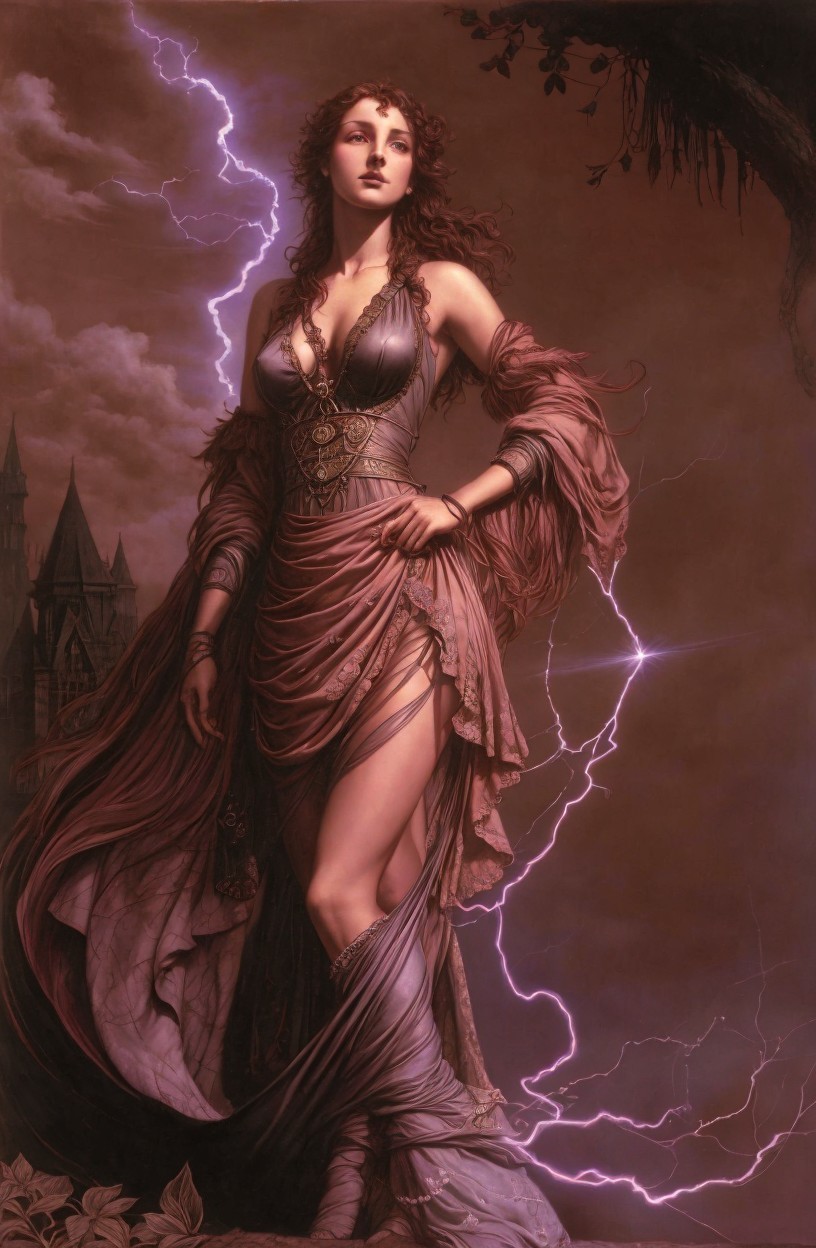 A glamorous woman stands confidently, adorned in a tight black corset and flowing gray drapery. She holds a glowing orb, emitting a spark of electricity, exuding power and elegance.