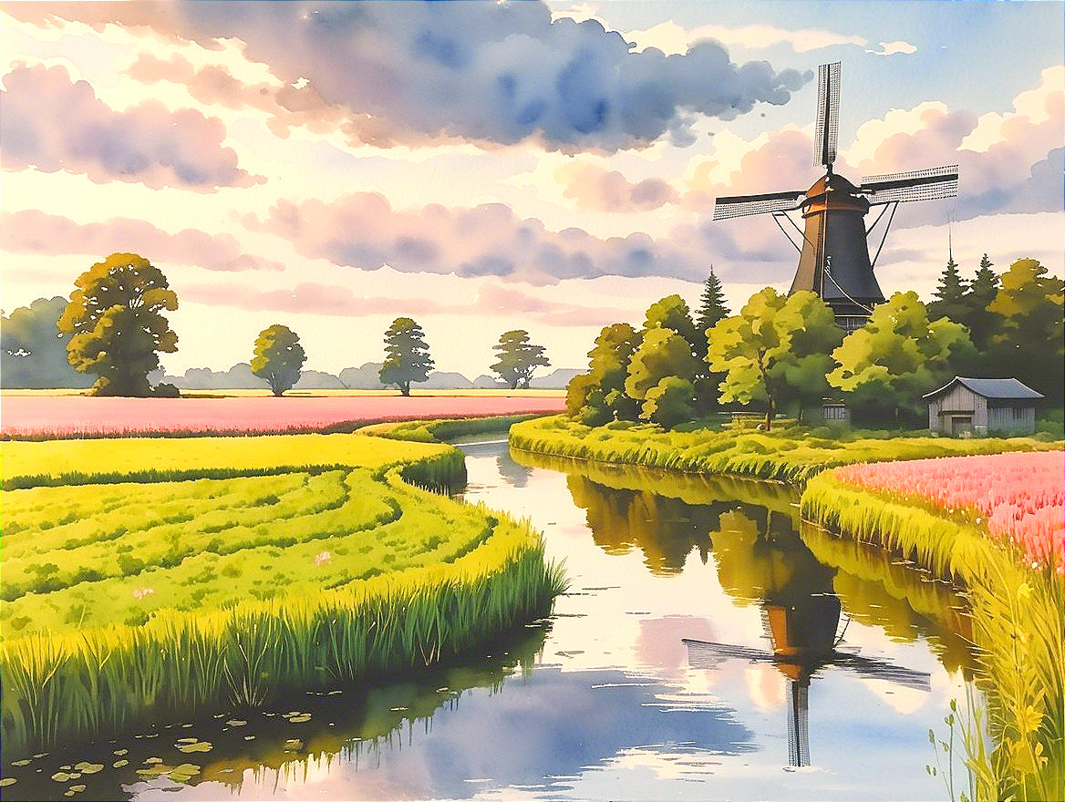 A serene landscape featuring a windmill by a calm river, surrounded by lush green fields and vibrant flowers under a sky filled with soft clouds during sunset.