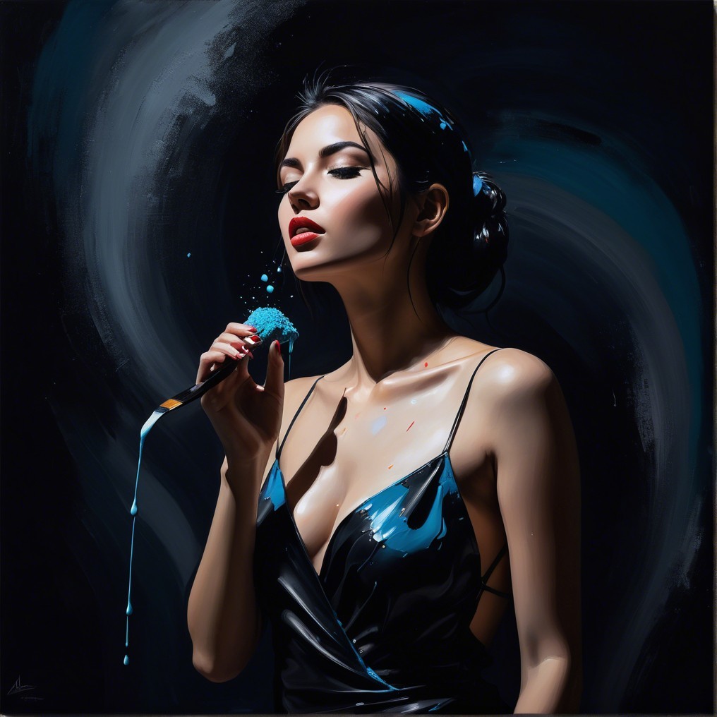 A poised singer with a microphone, bathed in dramatic lighting. She wears a sleek, dark dress, her eyes closed in expression. The background features swirling, abstract colors, enhancing the mood.