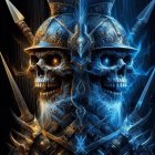 A powerful figure adorned in intricately detailed armor features three skulls as heads, embellished with jewels and a vibrant blue cloak, set against a mystical, forest-like background.