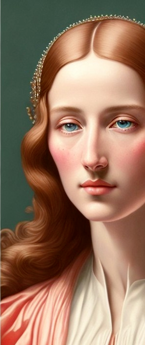 A portrait of a woman with delicate features, piercing blue eyes, wavy brown hair, and a subtle headband, set against a greenish background.