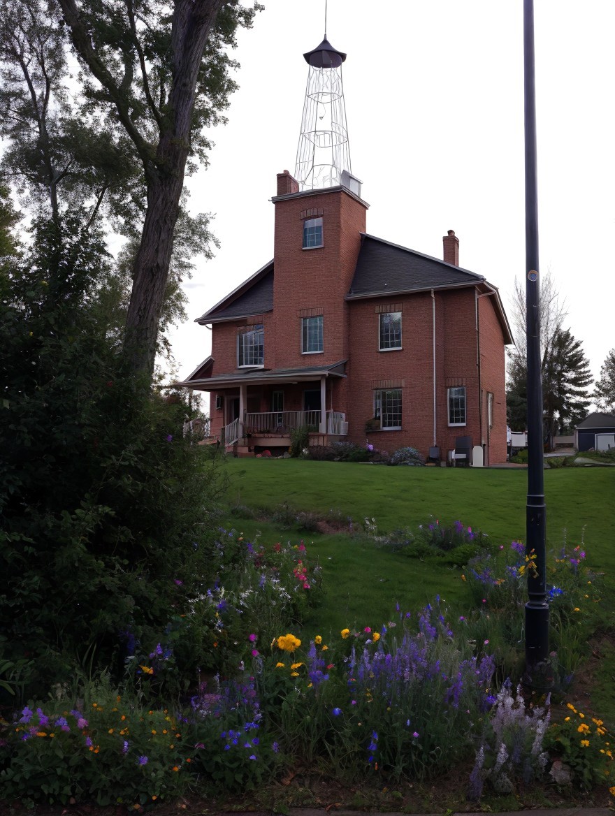 A quaint brick house with a unique cupola, surrounded by greenery and a well-maintained lawn, under a dusky sky.