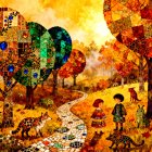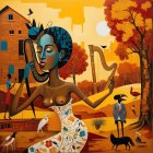 A woman plays two harps against a vibrant orange backdrop. Surrounded by autumn foliage, she captivates, while figures engage nearby, evoking a sense of harmony and artistic expression.