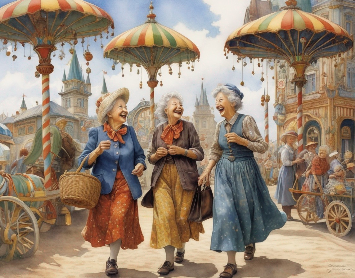 Three joyful elderly women walk arm-in-arm at a sunny fairground with a carousel, balloons, and bystanders in the background.