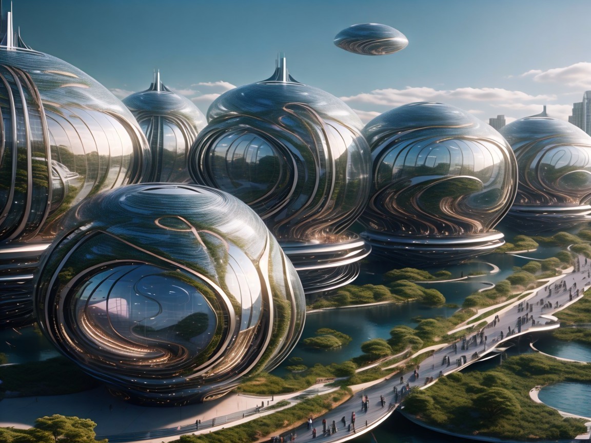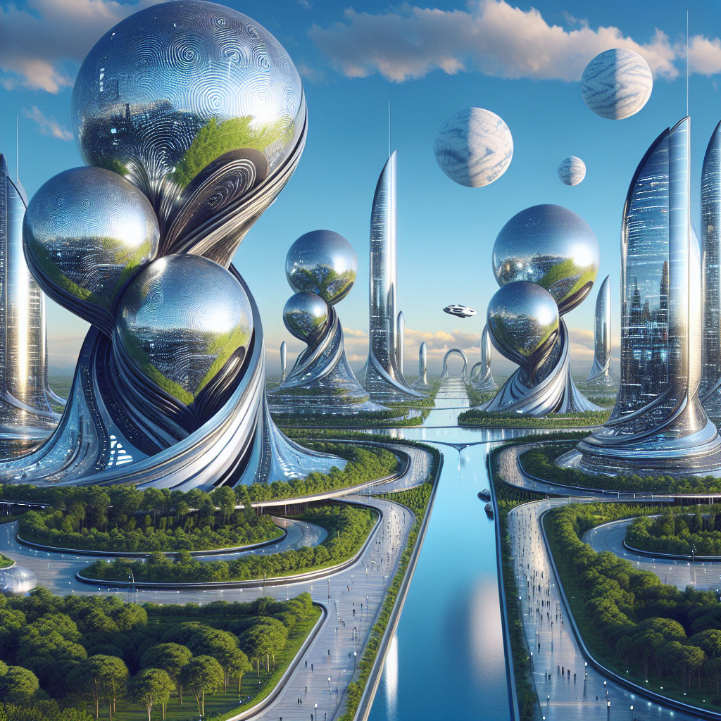 A futuristic landscape features sleek, tall towers with reflective glass surfaces beside a serene lake. Two people enjoy a boat ride, surrounded by lush greenery and a vibrant sky.