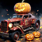 A red antique hot rod car with a glowing carved pumpkin on its roof is parked on a wooden surface, adorned with scattered autumn leaves. The hot rod has visible engine components, large circular headlights, and exhaust pipes extending from the engine compartment. The phrase "Tennie Whacker" is written in yellow