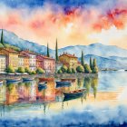 A serene watercolor scene of a lakeside village at sunset, featuring colorful houses reflected in calm waters, with boats gently floating and cypress trees lining the shore.