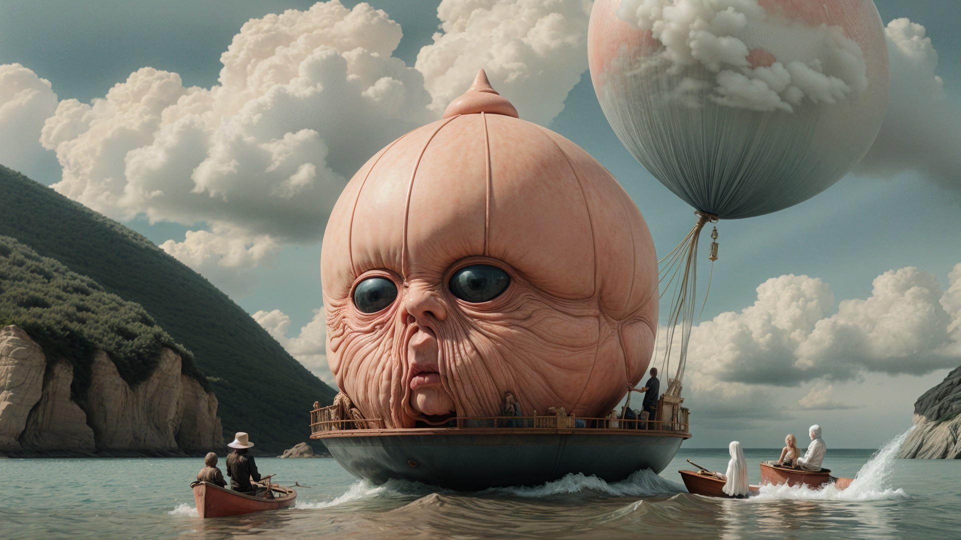 A fantastical scene featuring a large, surreal airship resembling a fleshy creature, floating above a serene body of water. Small boats navigate below, set against a backdrop of majestic mountains.