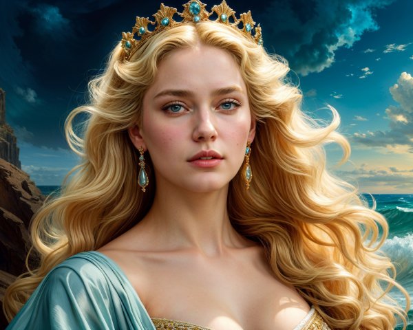 A young woman with soft curls gazes thoughtfully, wearing a vintage dress. The serene landscape behind her features a river and lush greenery, illuminated by the golden light of sunset.