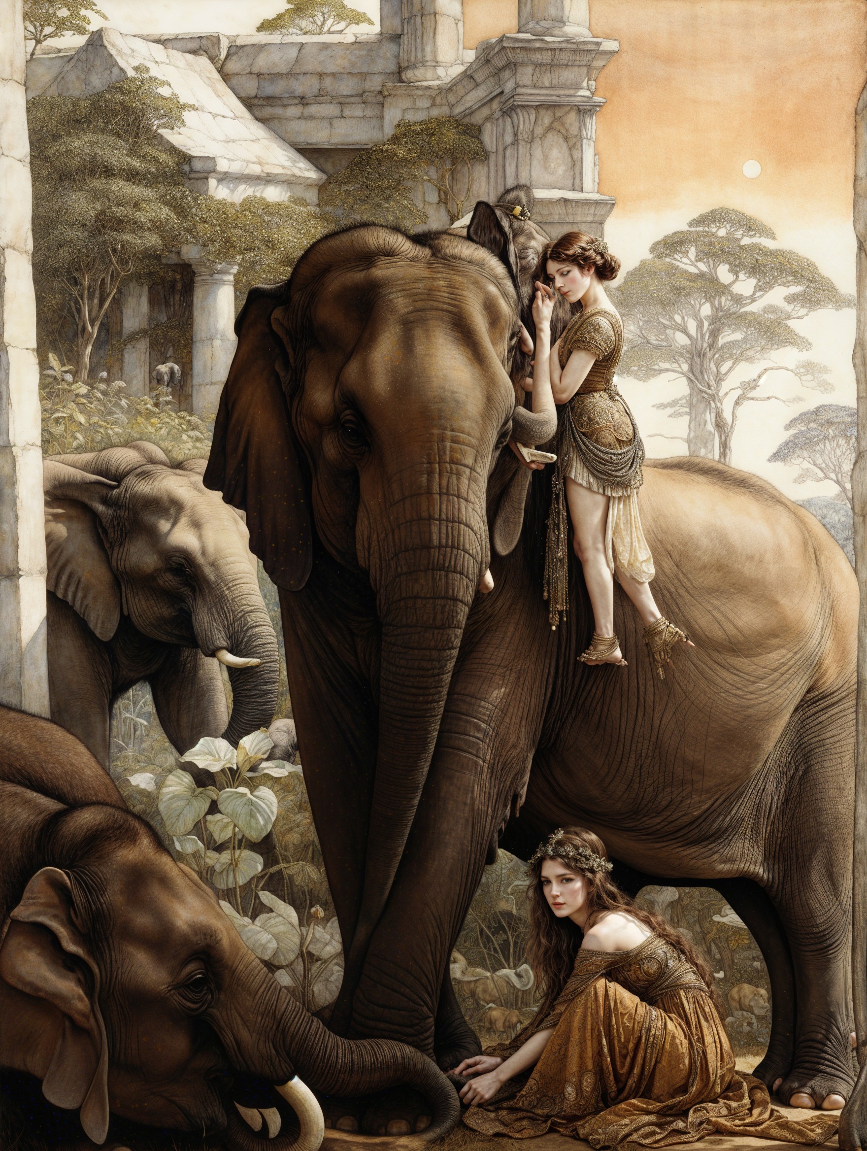 A serene scene with majestic elephants in a lush forest. A woman in an elegant dress interacts with one, while explorers observe from atop an elephant, capturing a harmonious connection with nature.