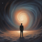 A lone figure in a suit stands on a cloud, gazing into a vibrant spiral galaxy that glows with warm oranges and deep blues, evoking a sense of wonder and exploration in the cosmos.