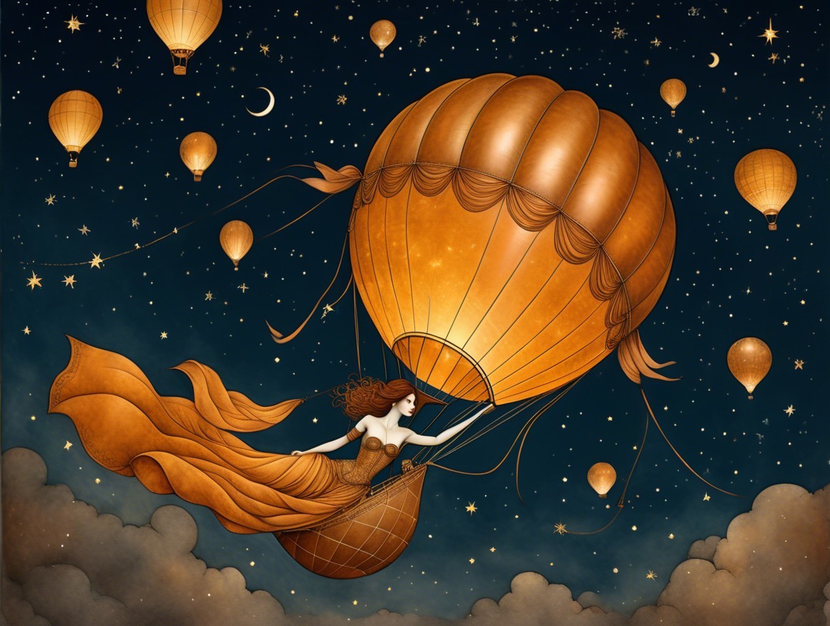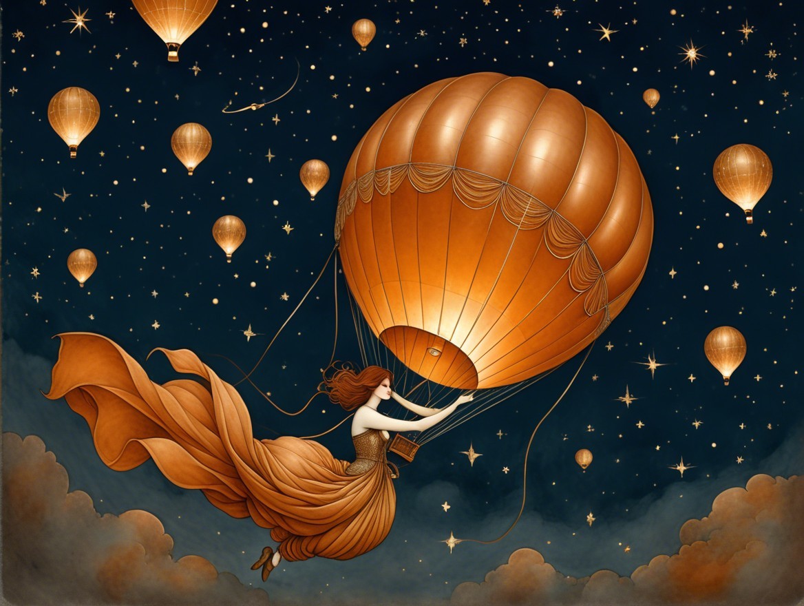 A whimsical illustration of a woman clinging to a floating balloon amidst a starry sky dotted with other balloons.