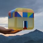 A hand holds a colorful geometric sculpture against a backdrop of mountains under a cloudy sky. The sculpture features translucent materials and vibrant patterns, blending nature and artistry.