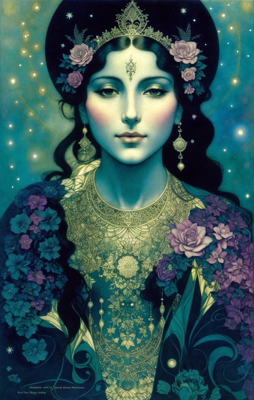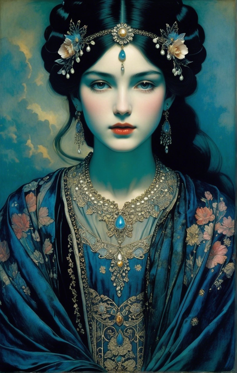 A serene portrait of a young woman in a beautifully detailed dark blue gown adorned with floral patterns. Her long, dark hair is styled elegantly, with a flower accentuating her look.