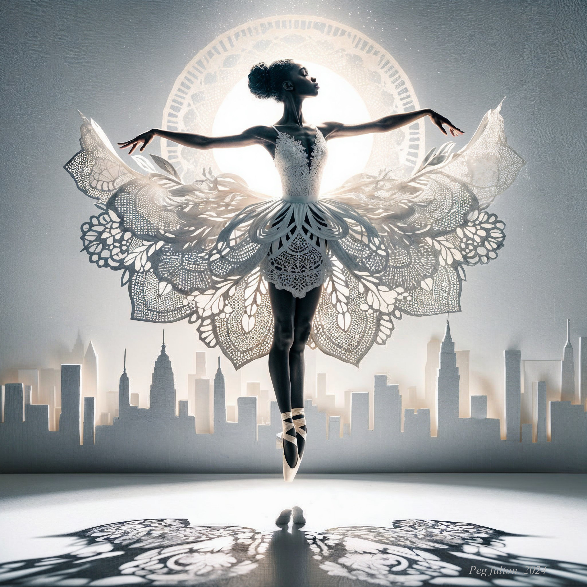 A graceful ballet dancer in a stunning lace-like white costume leaps majestically against a backdrop of a city skyline, illuminated by a radiant moon, creating a dreamlike atmosphere.