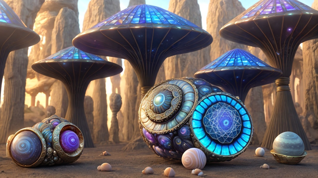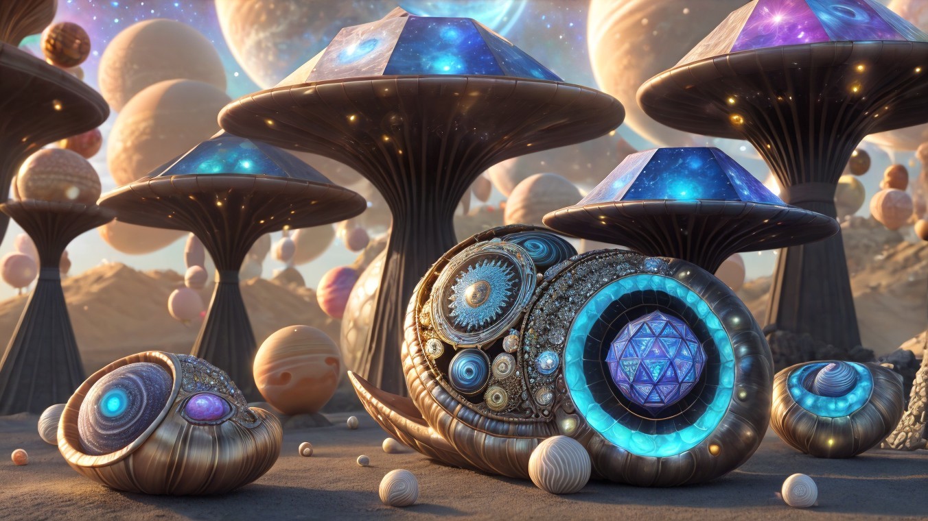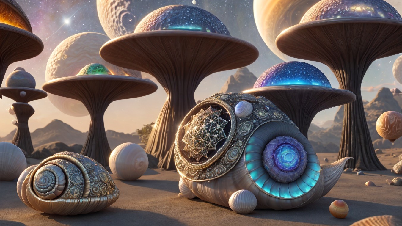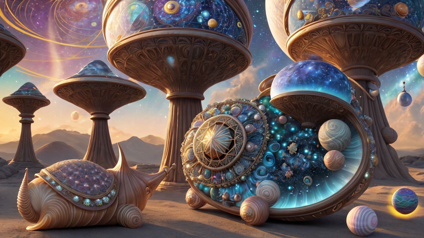 A fantastical landscape with snail-shell structures and celestial bodies in a vibrant alien sky.
