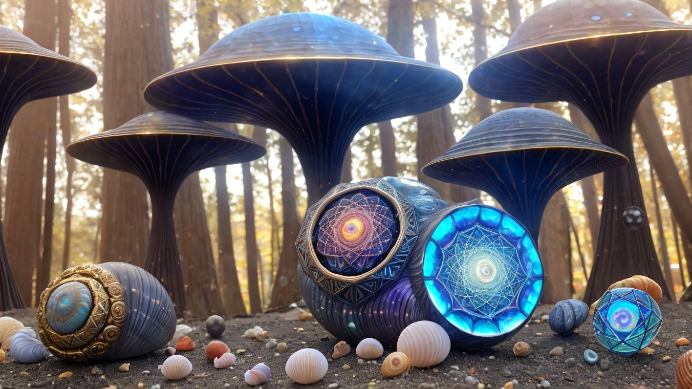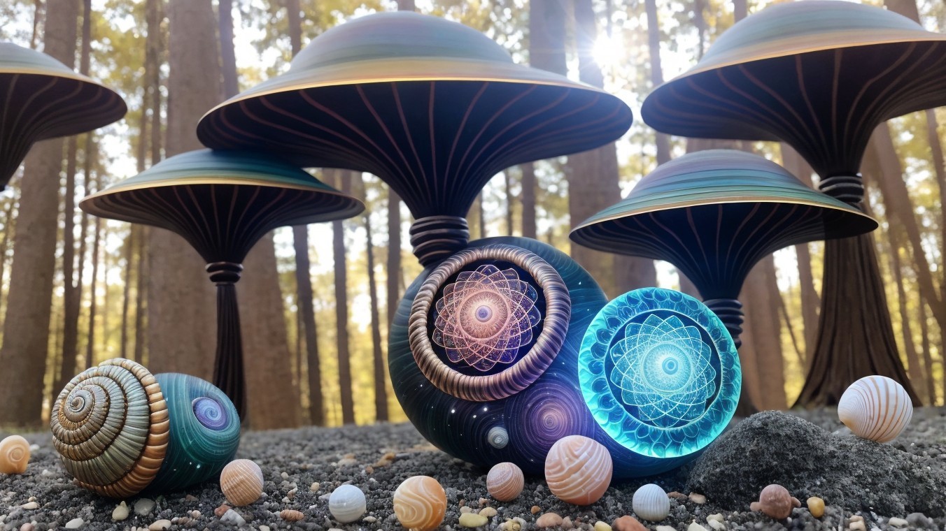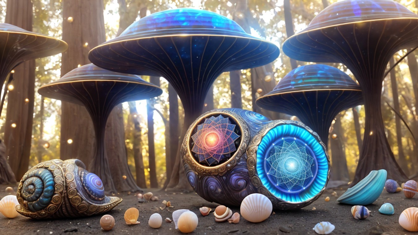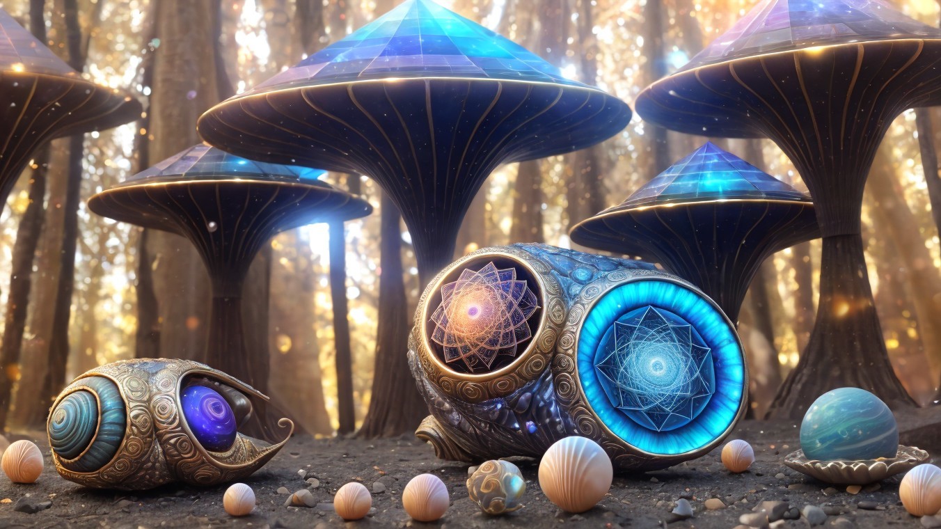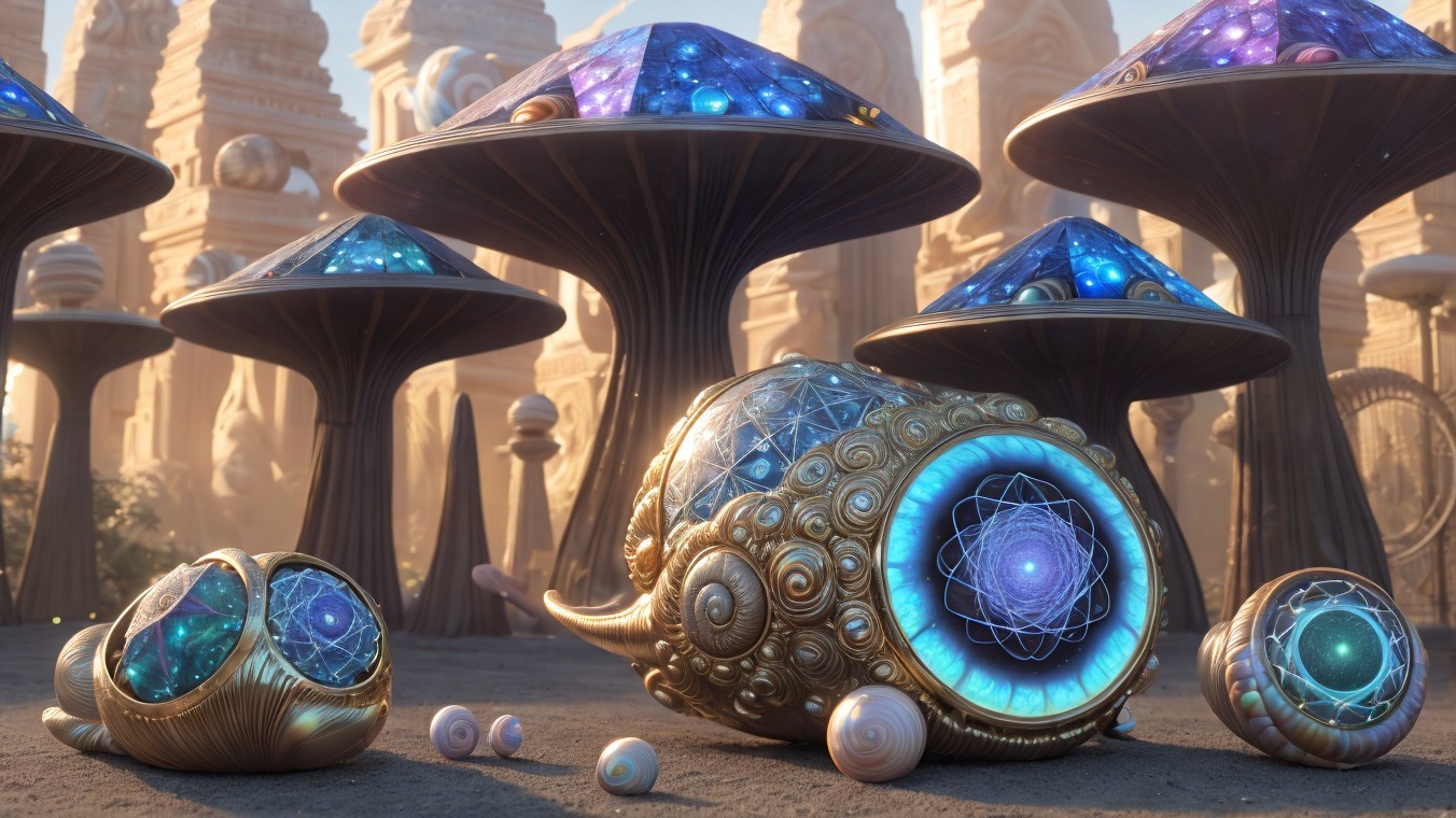 A fantastical landscape with snail-shell structures and celestial bodies in a vibrant alien sky.