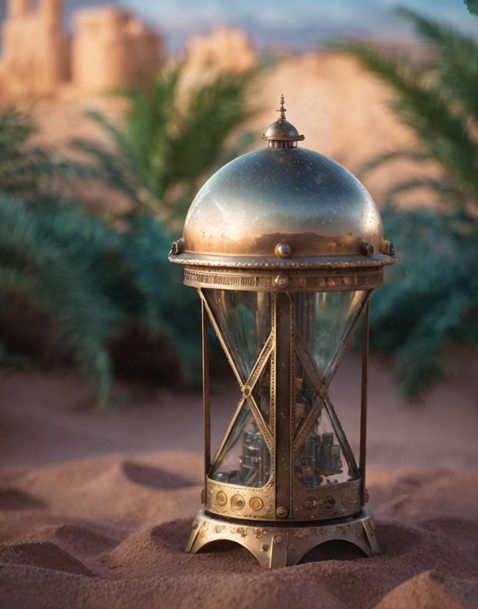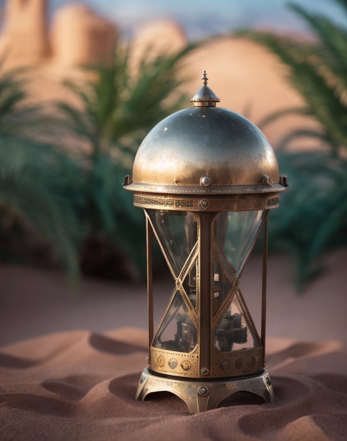 A vintage lantern sits elegantly on sandy terrain, its ornate design featuring a glass dome and intricate metalwork. Lush palm leaves frame the background, hinting at a desert oasis setting.