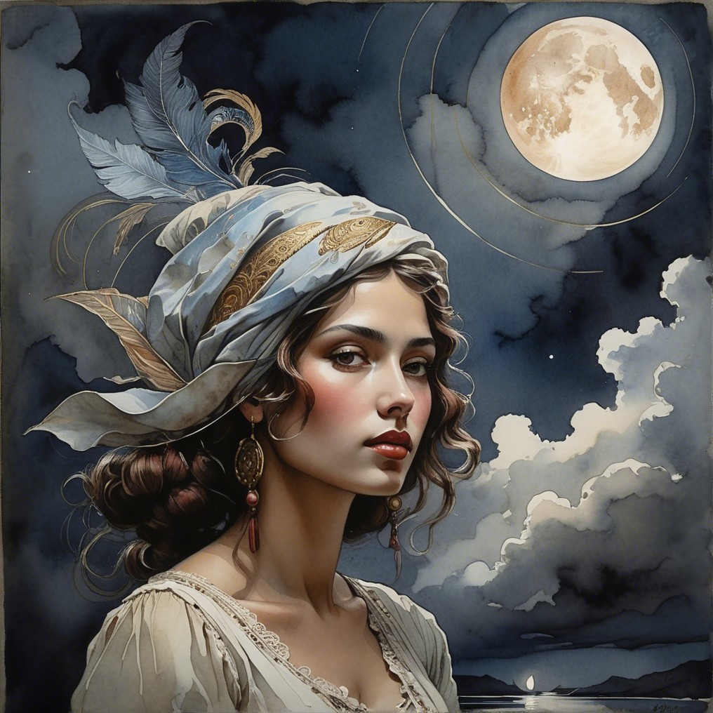 Gypsy shaman. , colored ink drawing, watercolor artwork on old withered paper, vintage, by Caravaggio, Fragonard, Anton Pieck, pale colors, high detail, intricately detailed, hyperdetailed volumetric lighting, art nouveau graphic steampunk ., whimsical, beautiful, poignant, touching. colors indigo, gold, rust, burgundy, black. soft watercolor extra water in Art Deco by Annigoni, Egon Schiele, Milo Manara, Botticelli, Catrin Welz-Stein, Jean Metzinger, Klimt, perfect eyes, perfect handsface, highly detailed, complementary colors, hyper detailed. Watercolor and ink splatter, dynamic pose, dark blue background, unreal engine, alphonse mucha, global illumination, detailed and intricate environment Beautiful woman in the style of Pino Daeni Dorota Piotrowiak Edward Gorey, junji ito, klimnt , gold leaf color, silver leaf color