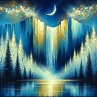 A stunning, abstract landscape featuring a waterfall cascading from golden cliffs under a crescent moon. Surrounded by frosty trees and a tranquil lake reflecting vibrant blues and golds.