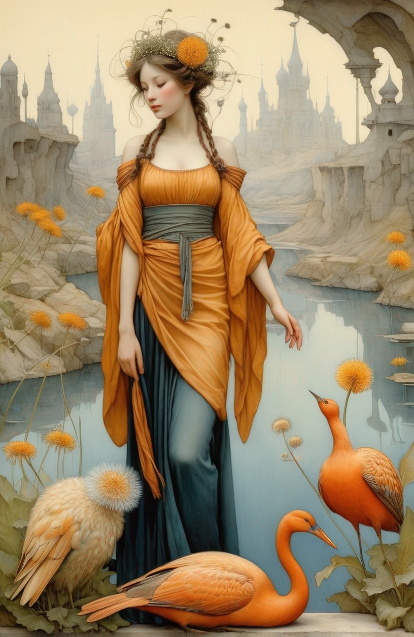 A woman in a flowing gold and blue gown stands by a serene lake with red flowers and a castle backdrop.