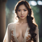 A young woman with long, flowing hair stands in natural light, wearing an elegant, floral-embroidered garment that highlights her features against a lush, green backdrop.