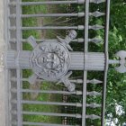 The image features a decorative wrought iron gate with a central emblem. The design includes geometric shapes and a circular motif, set against a backdrop of lush green foliage.