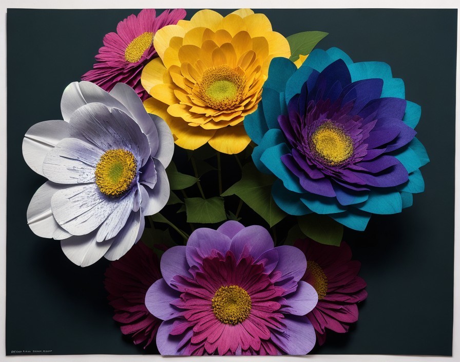 A vibrant artwork depicting large, multicolored paper flowers with detailed petals and centers, set against a dark background.