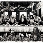 A darkly themed reinterpretation of "The Last Supper," featuring gothic characters, vampires, and skeletons, all gathered around a long table, creating a haunting yet captivating atmosphere.