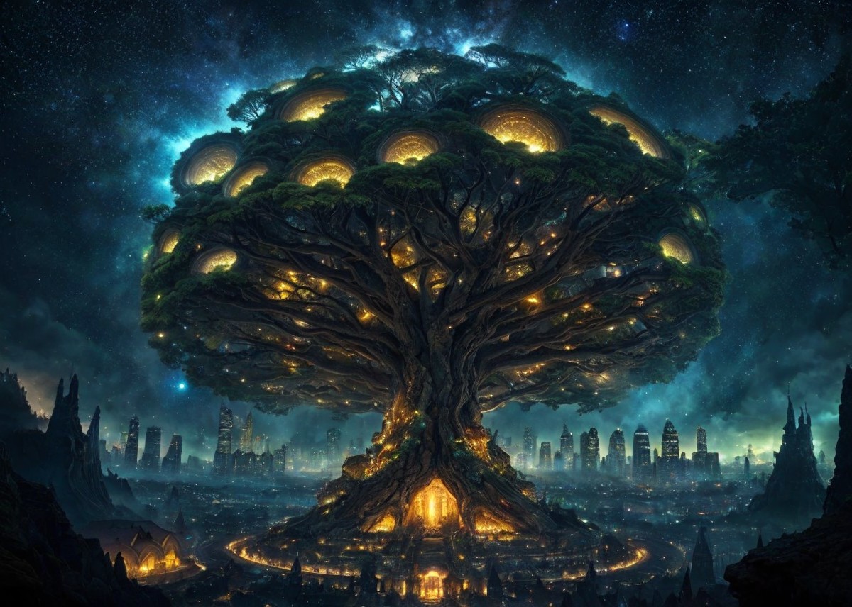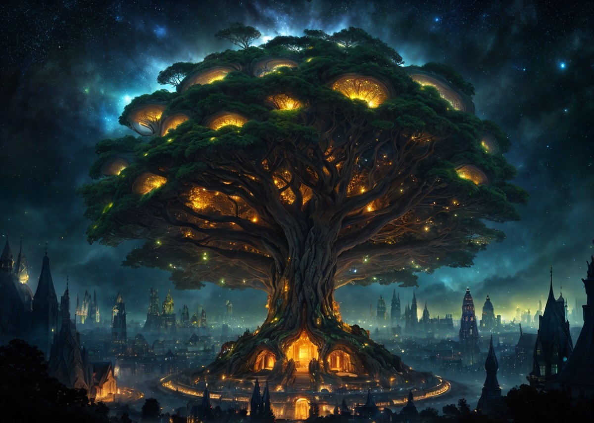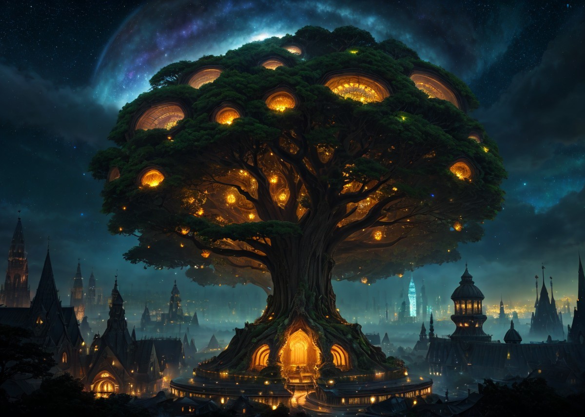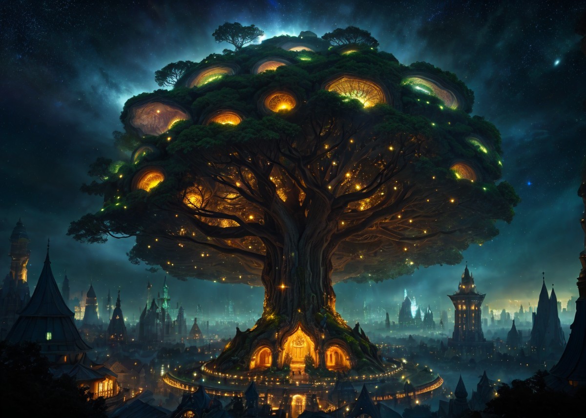 A fantastical tree with glowing windows under a starry sky, surrounded by quaint houses and towering spires in a mythical setting.