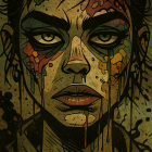 The image features a striking, stylized portrait of a woman with intense eyes and colorful paint splatters on her face, creating a dramatic and edgy atmosphere. Bold lines accentuate her features.