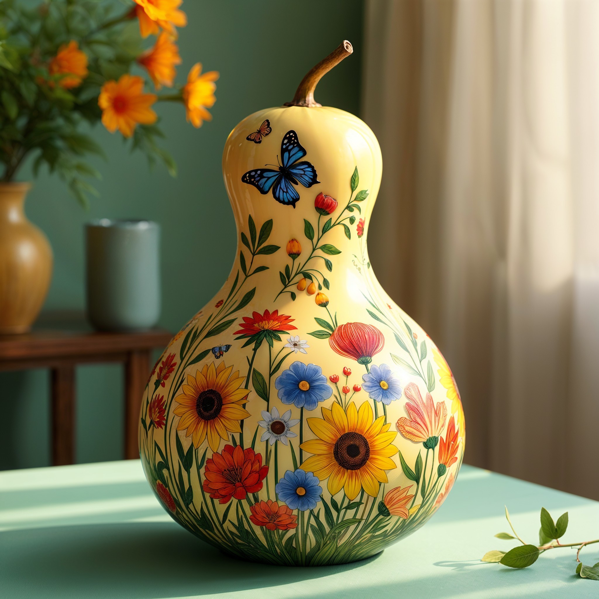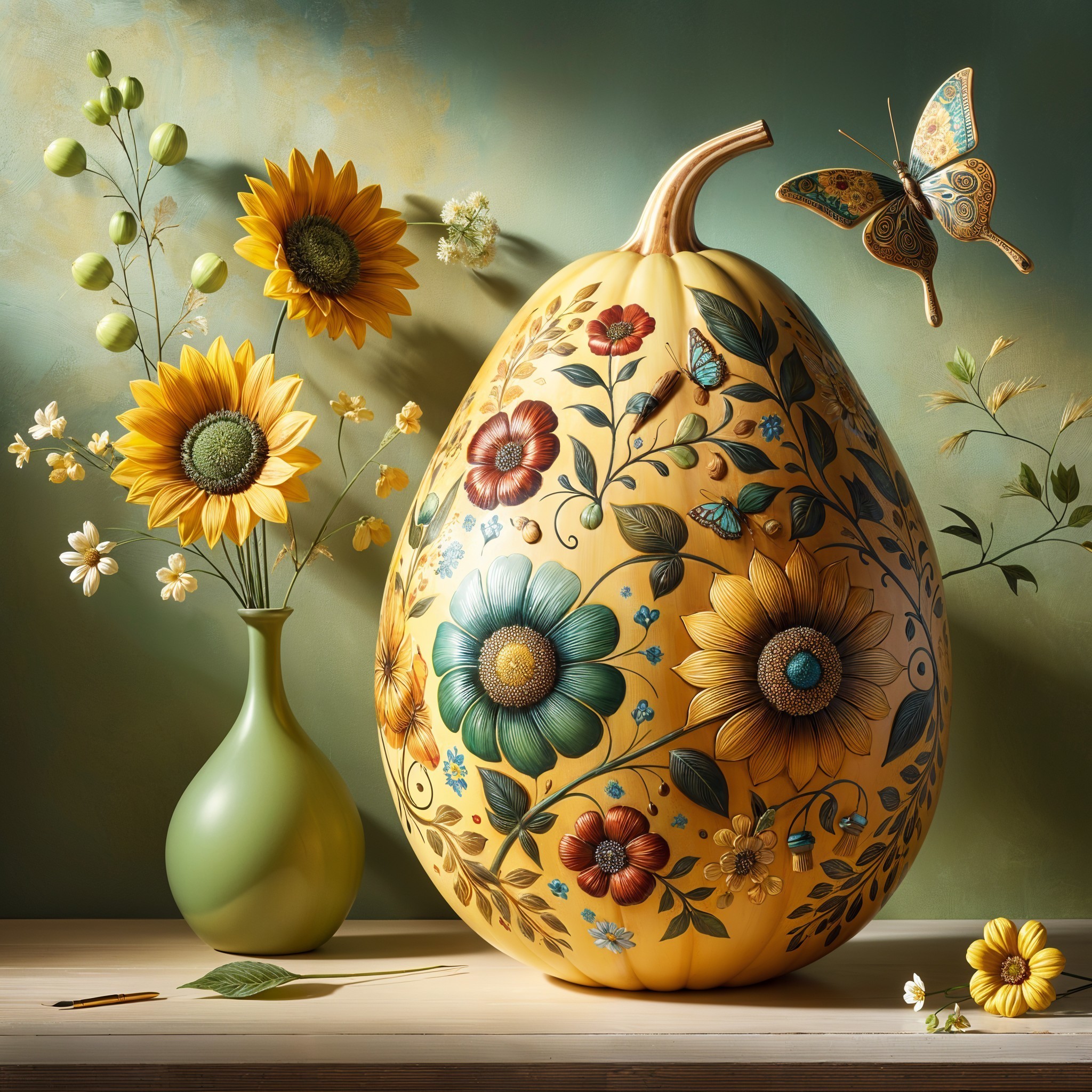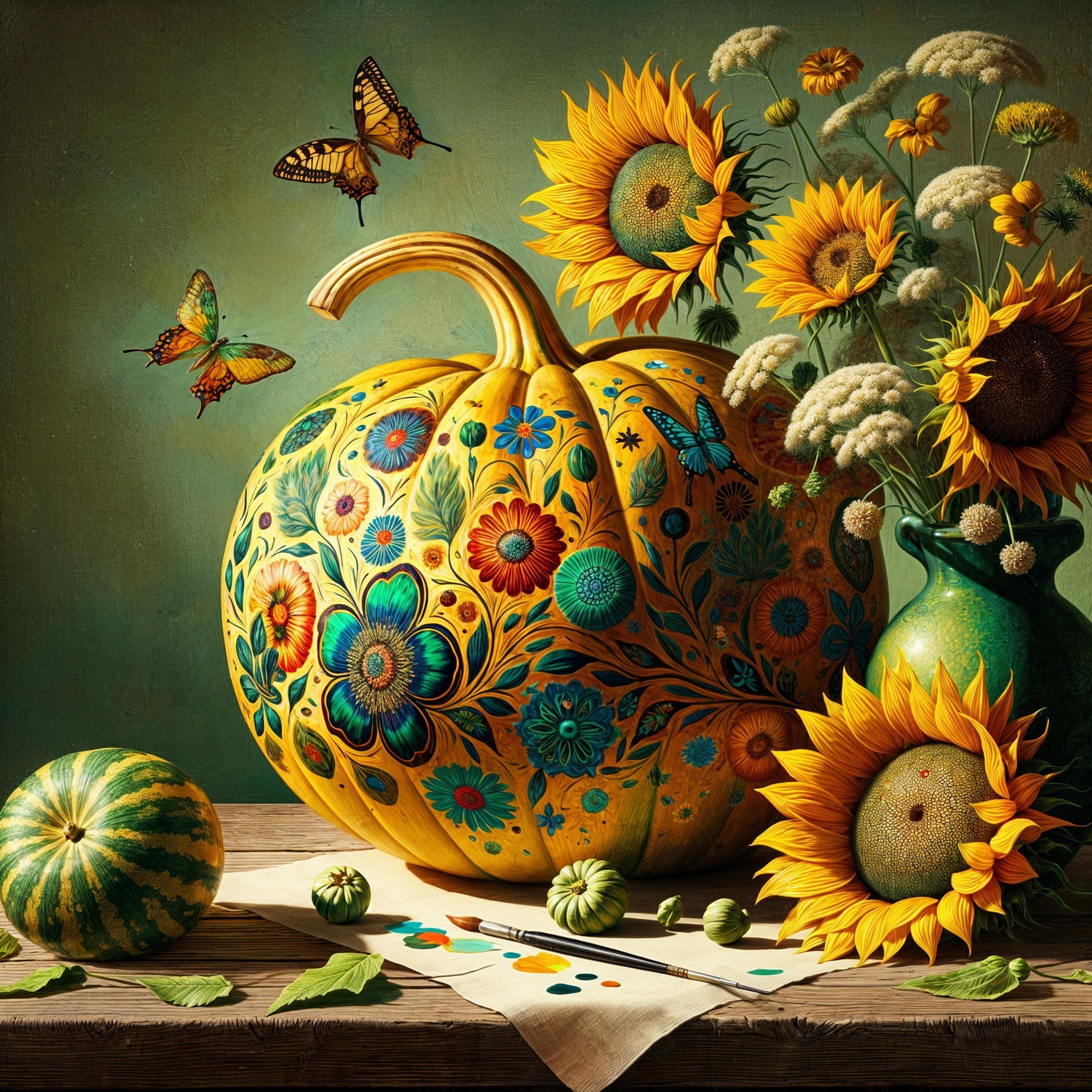 A vibrant still life features intricately painted pumpkins in various sizes, surrounded by colorful butterflies and sunflowers, set against a rich green backdrop, showcasing artistic creativity.