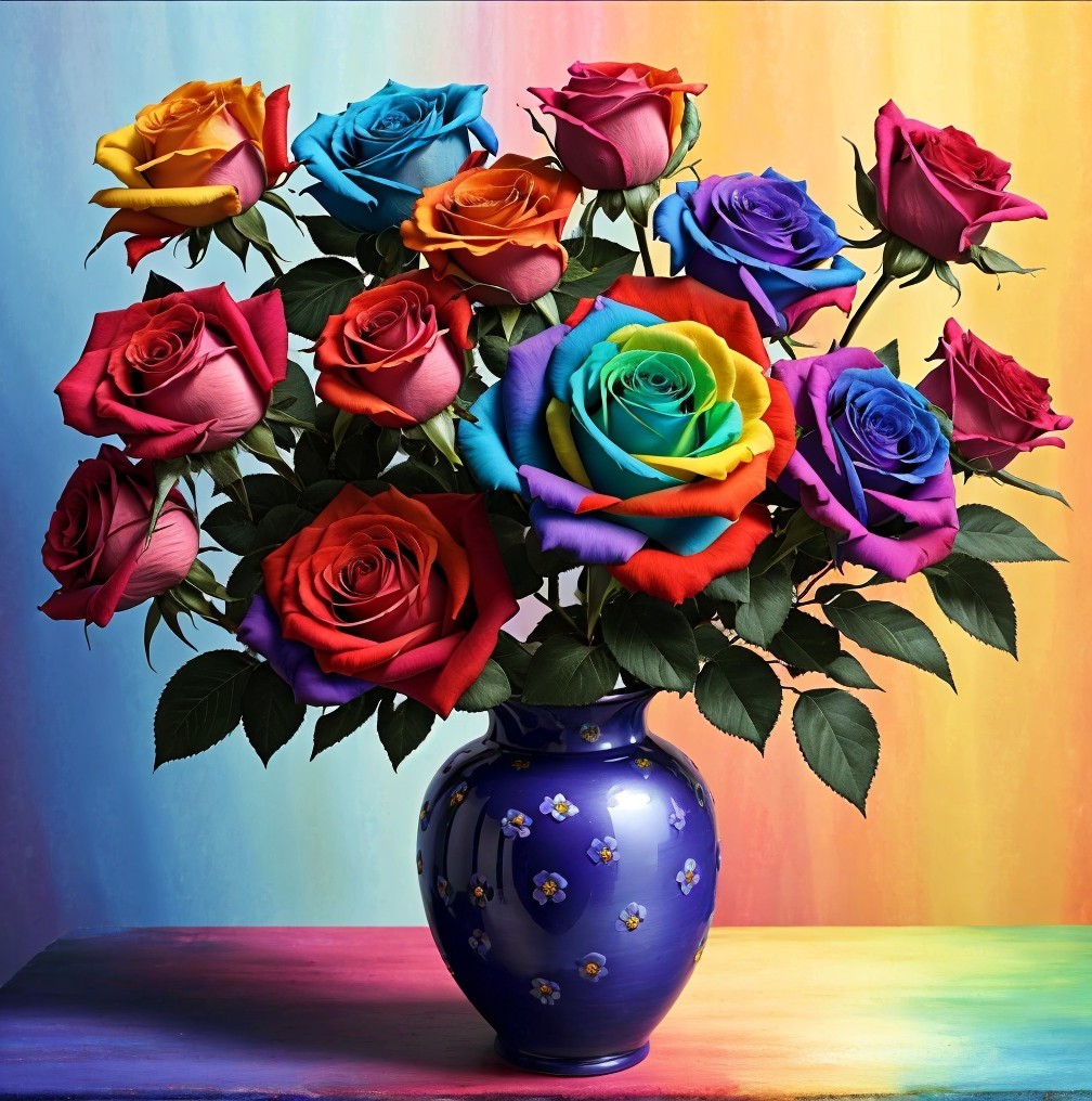 A vibrant bouquet of multi-colored roses in a blue patterned vase against a gradient background.