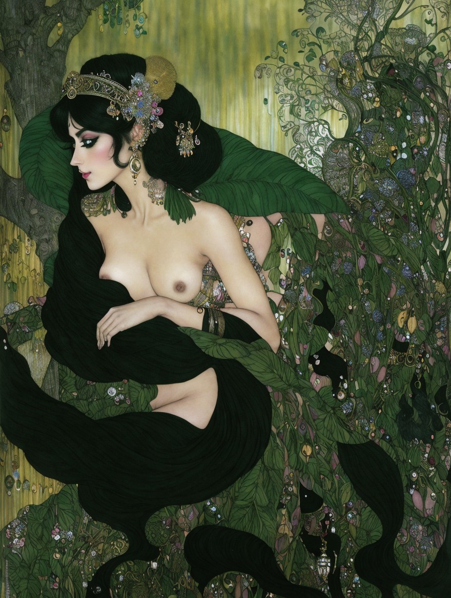 An illustration of a woman with long wavy hair, wearing a green turban, ornate earrings, and a serious expression.
