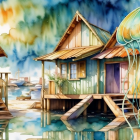 A whimsical scene of colorful houses on stilts, surrounded by vibrant water reflections. The sky is filled with dramatic, dripping colors, creating a surreal, dreamlike atmosphere.