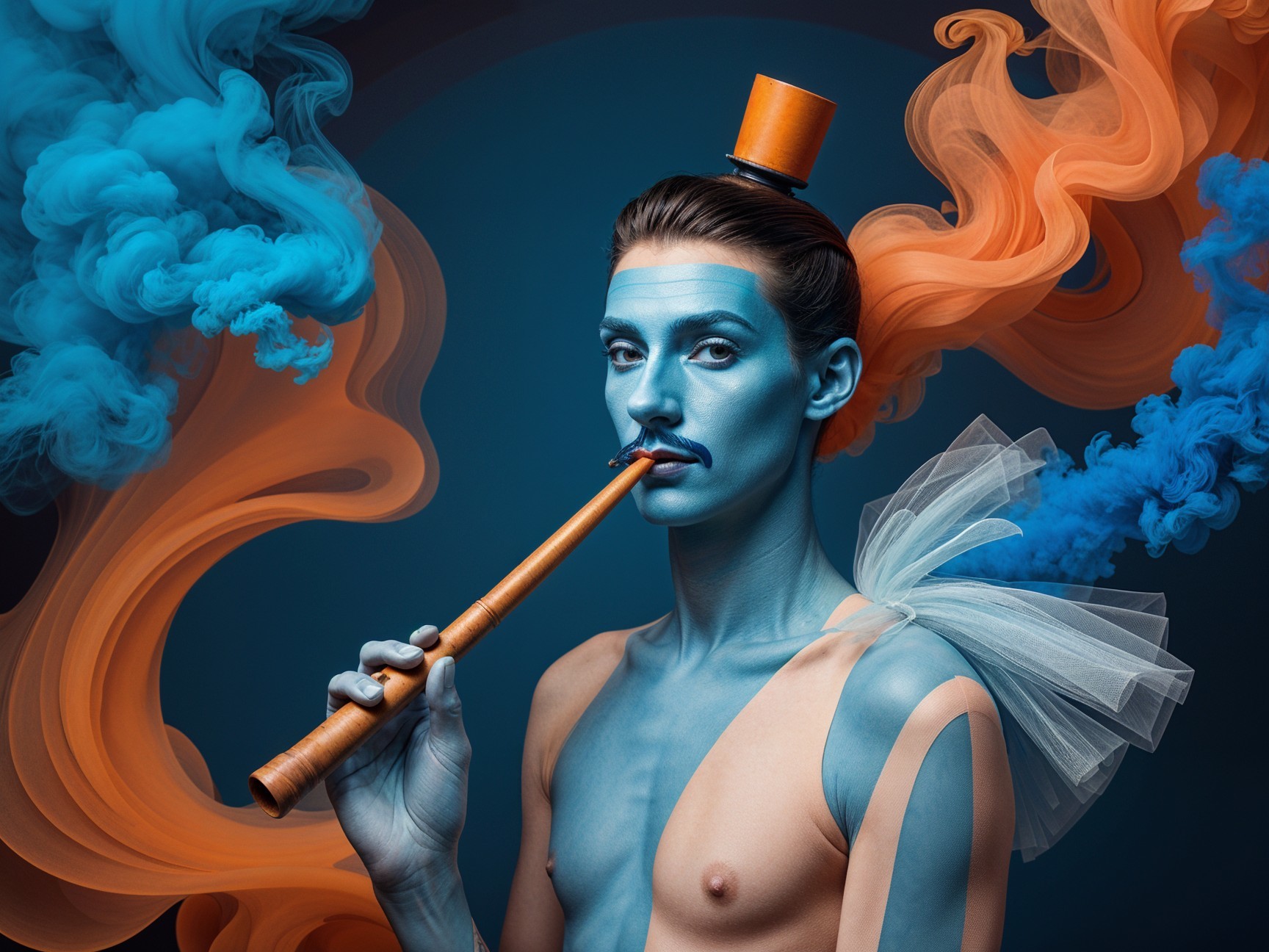 Man with elongated features, abstract facial features, holding a vintage crack pipe, surreal smoke shapes, tall and thin blue-skinned ballerina, delicate tutu comes out of the pipe's smoke. whimsical and dreamlike, Picasso-inspired style, cubist elements, geometric shapes, vibrant colors, avant-garde composition, artistic interpretation, creative and imaginative concept, high level of abstraction, unique and unconventional, visual storytelling, digital art platform.