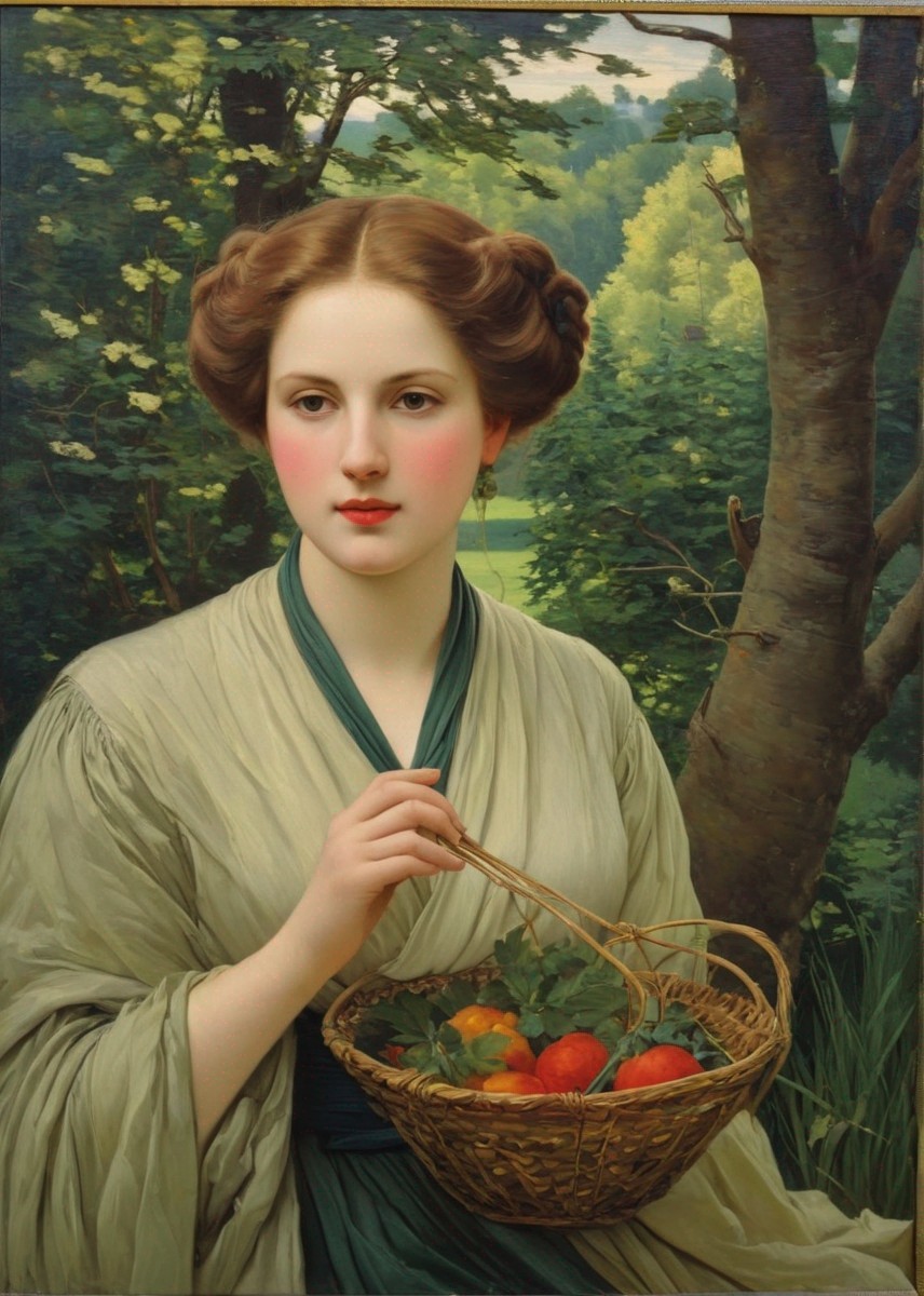 A painting of a woman in a white dress and red headwrap standing pensively in a wooded landscape with rolling hills in the background.